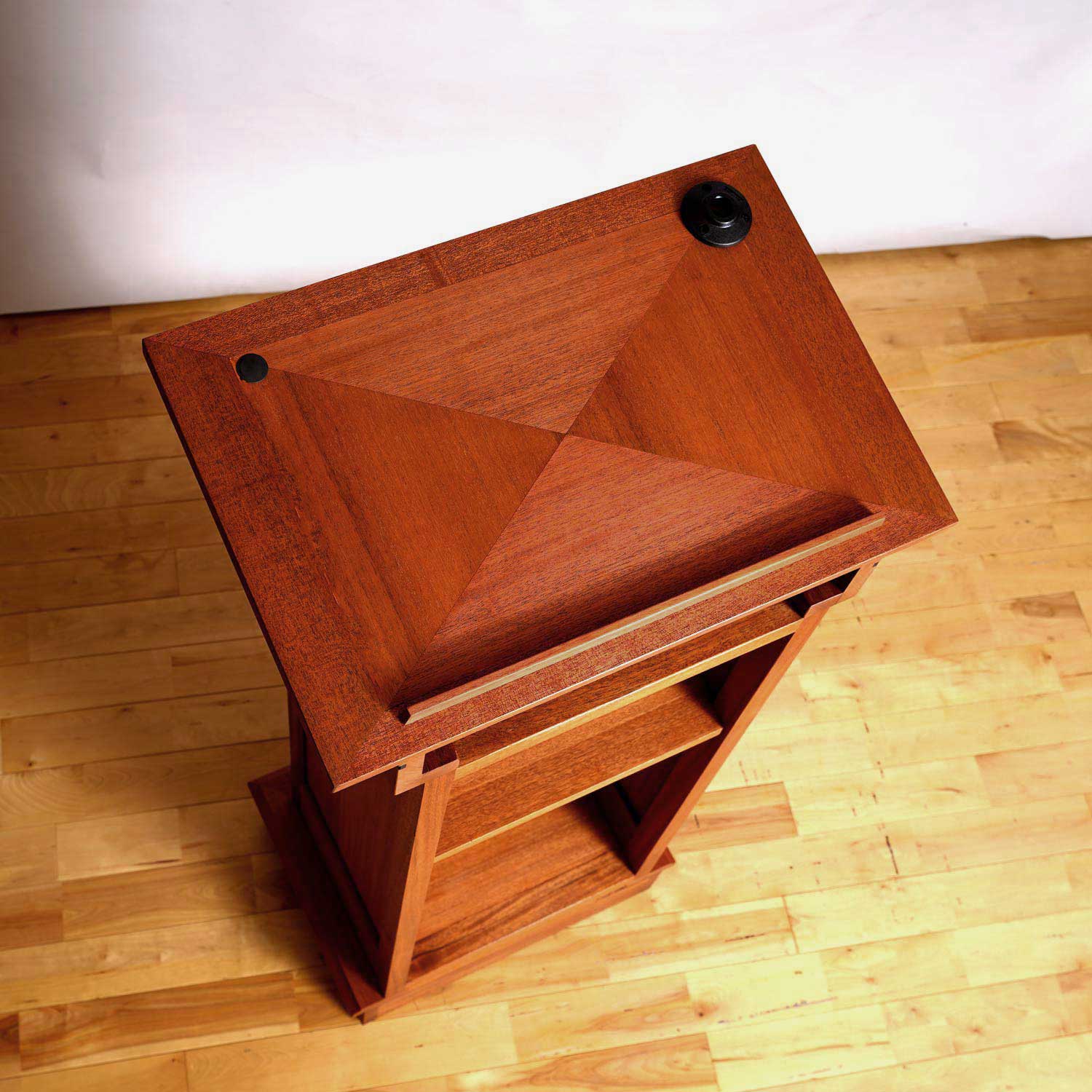 書見台はマホガニーの枠材に、同じマホガニーの柾目の厚突き板をダイヤモンド クオーター張りに練ったものを落とし込んでいます。
