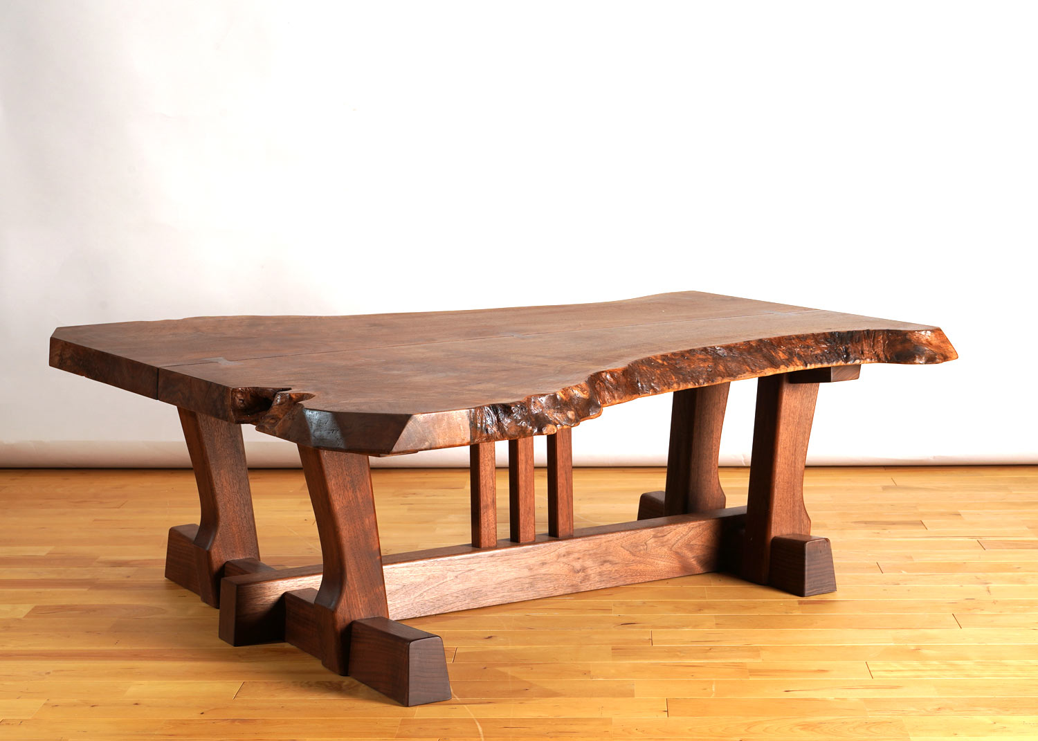 なお、これは一枚板ではなく、一本のクラロウォールナットの丸太から製材されたものをブックマッチ様に繋げたものですが、いかにも一枚の板のような趣きになっています。