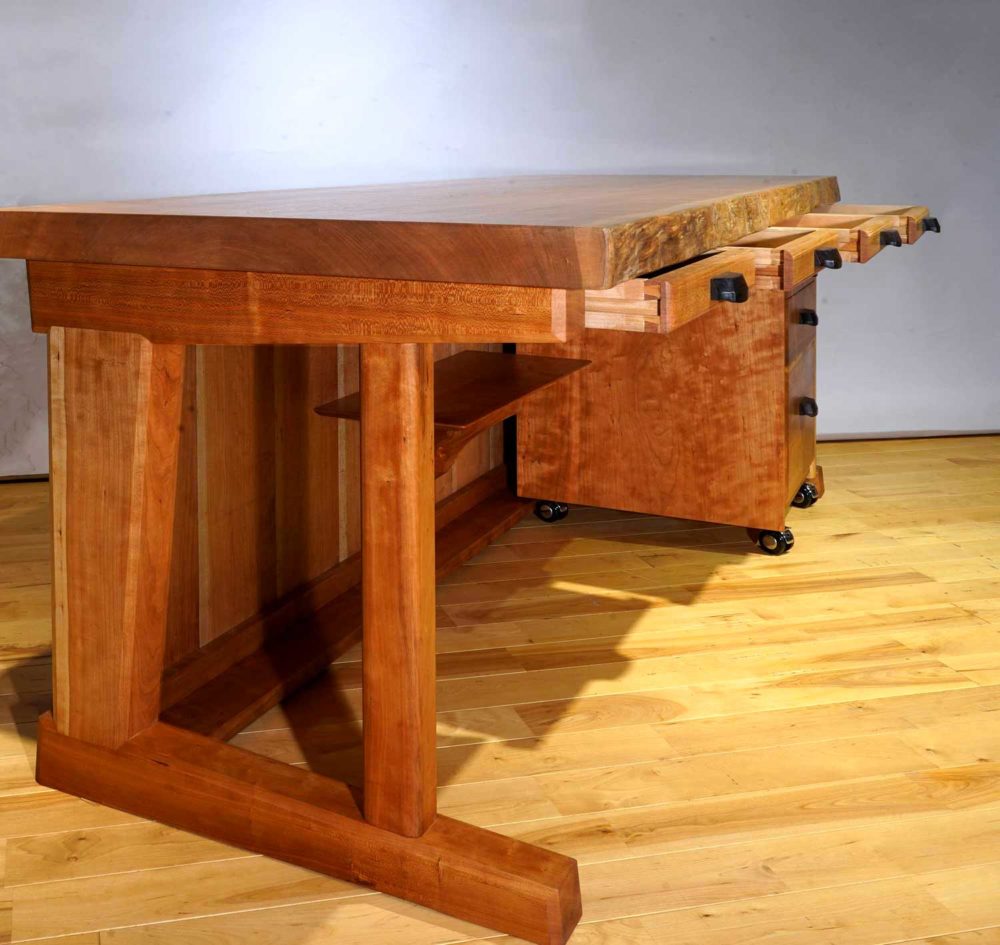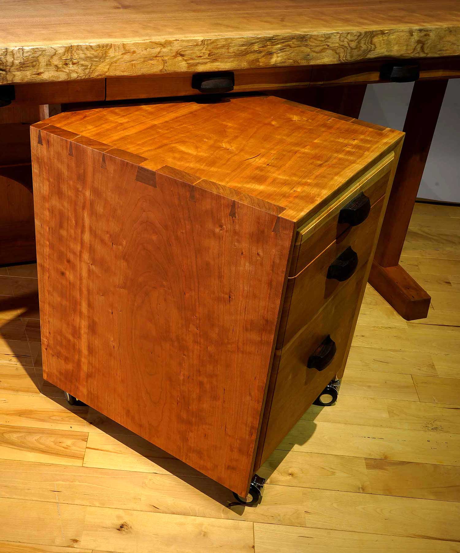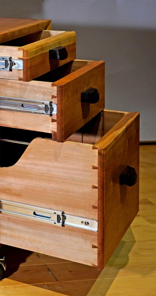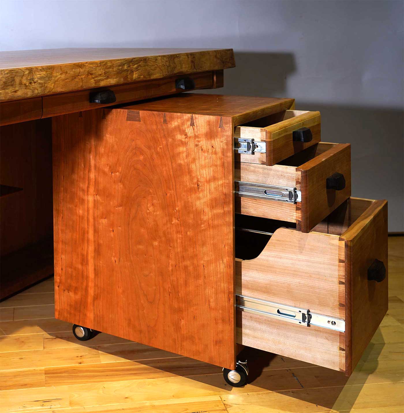 仕上げ削りしている天板の画像、および脚部と結合させる仕口加工〈寄せ蟻加工途上〉をご覧いただけるとお分かりのように、全面に縮杢(チジミモク)が配されたすばらしい木味のものですが、デスク本体、および2つのワゴン抽斗についても、この天板の品質に負けず劣らずのクォリティーで作らせていただきました。