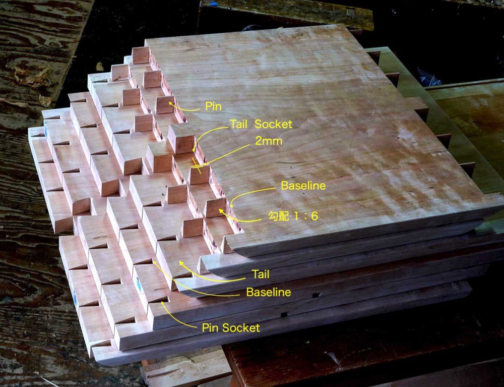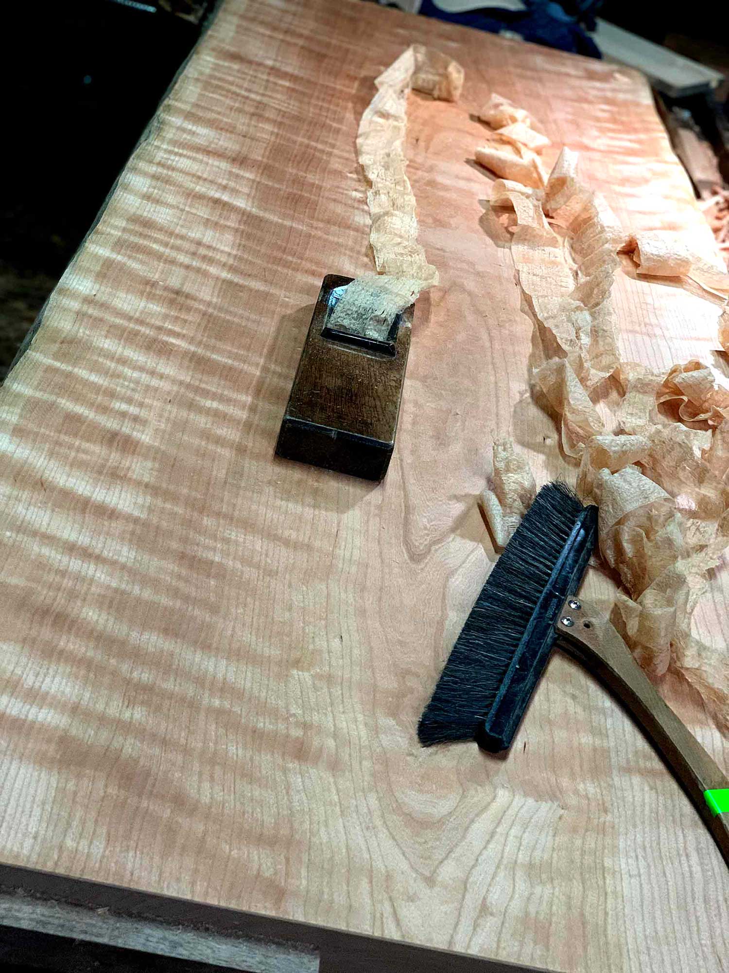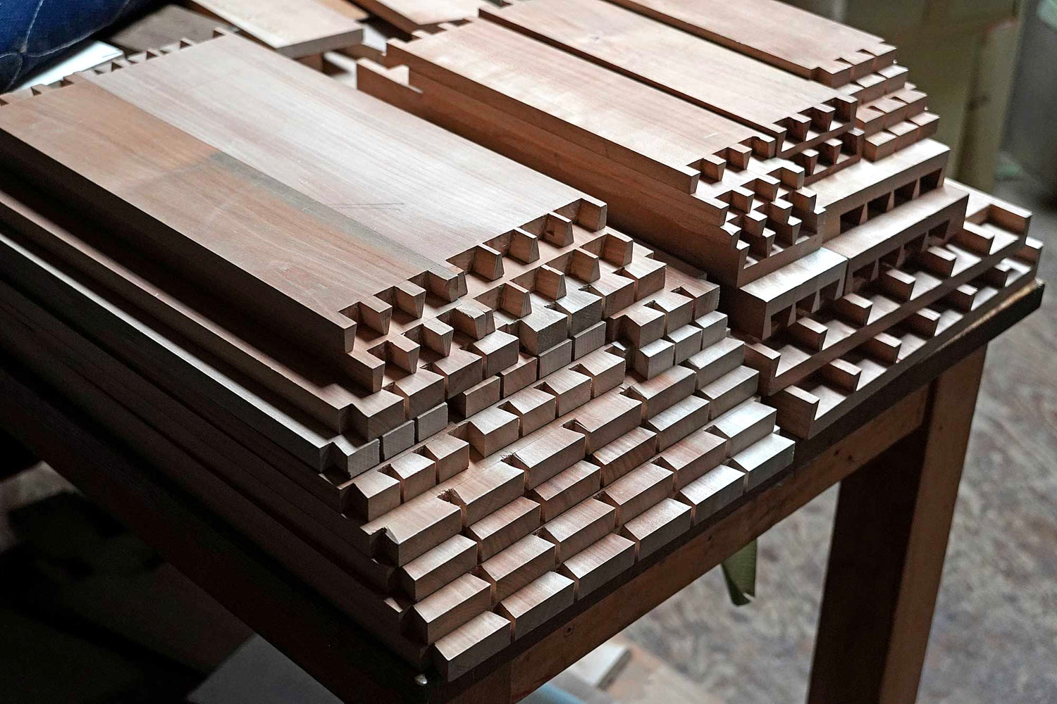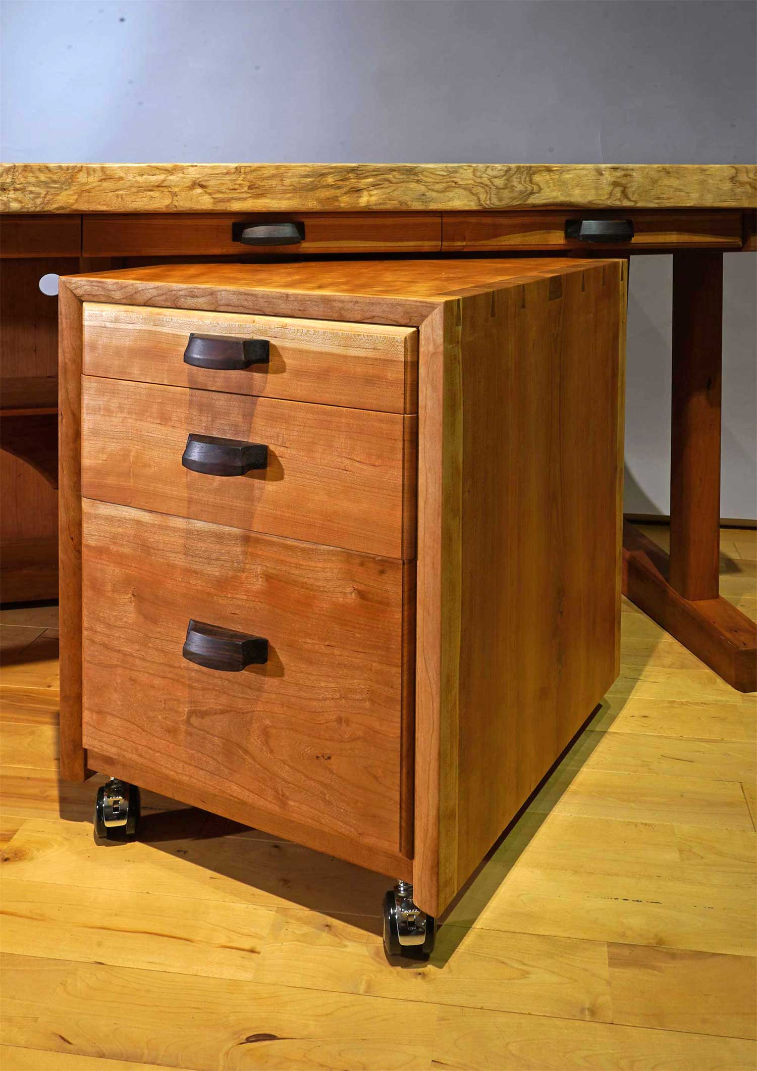 仕上げ削りしている天板の画像、および脚部と結合させる仕口加工〈寄せ蟻加工途上〉をご覧いただけるとお分かりのように、全面に縮杢(チジミモク)が配されたすばらしい木味のものですが、デスク本体、および2つのワゴン抽斗についても、この天板の品質に負けず劣らずのクォリティーで作らせていただきました。
