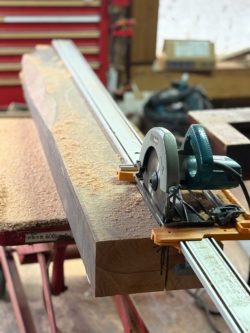 やむを得ず、専用のレールを用い、刃径7.5インチのやや大きな丸ノコを表裏両方から入れ、挽き割るという面倒な手法に甘んじざるを得ませんでした。