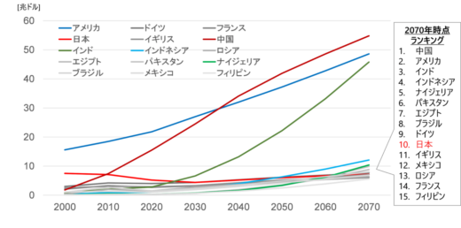 下図は〈2070年までの世界のGDPとランキング予測〉というものです。
