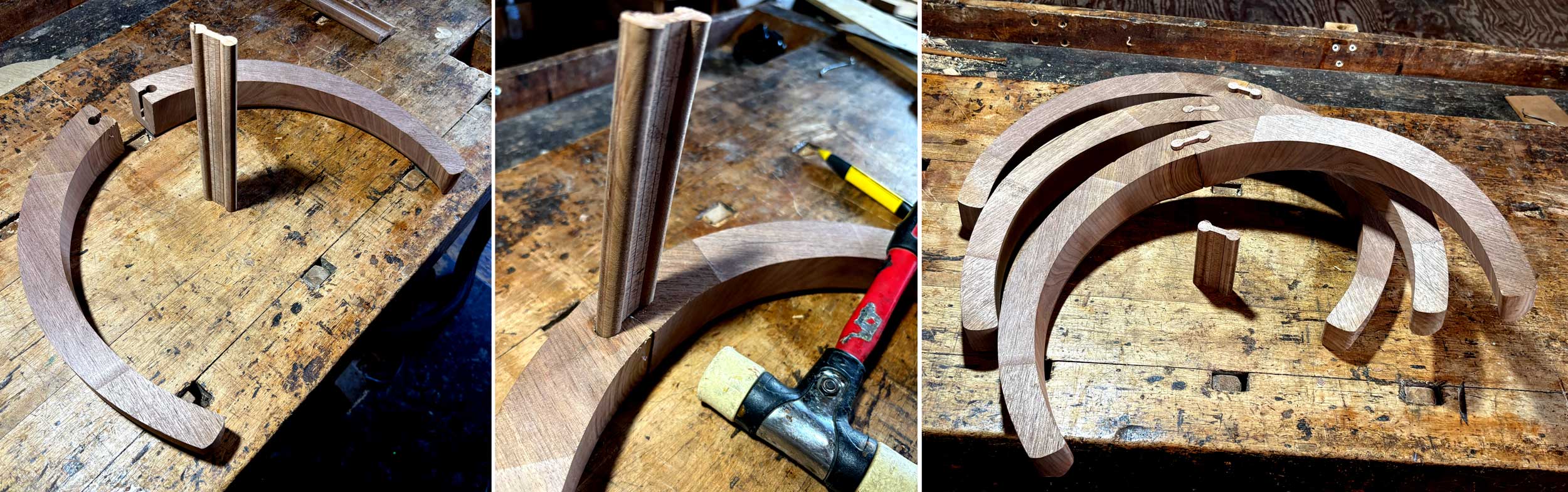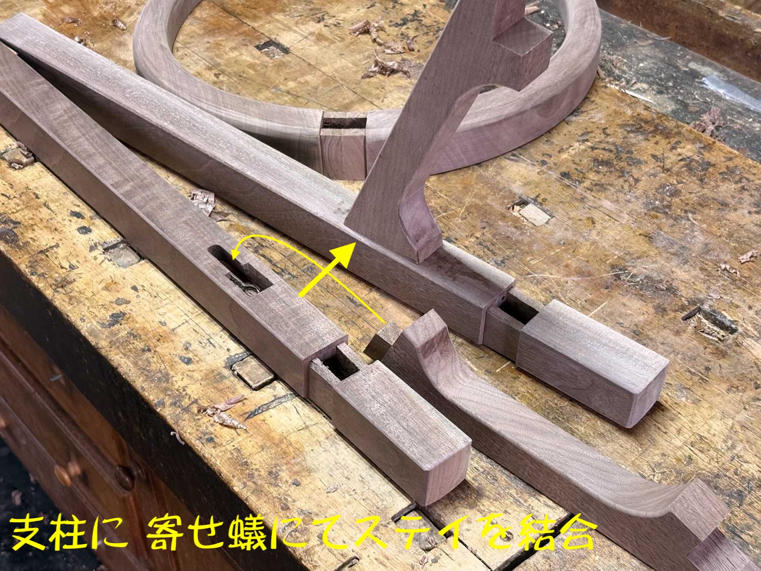 そこで、半分づつ作り、中央部分で繫げ、馬蹄形とするのですが、この接合部は〈枘+接着材〉に依らない、より堅固な仕口である〈おしゃぶり〉で適えるということです。