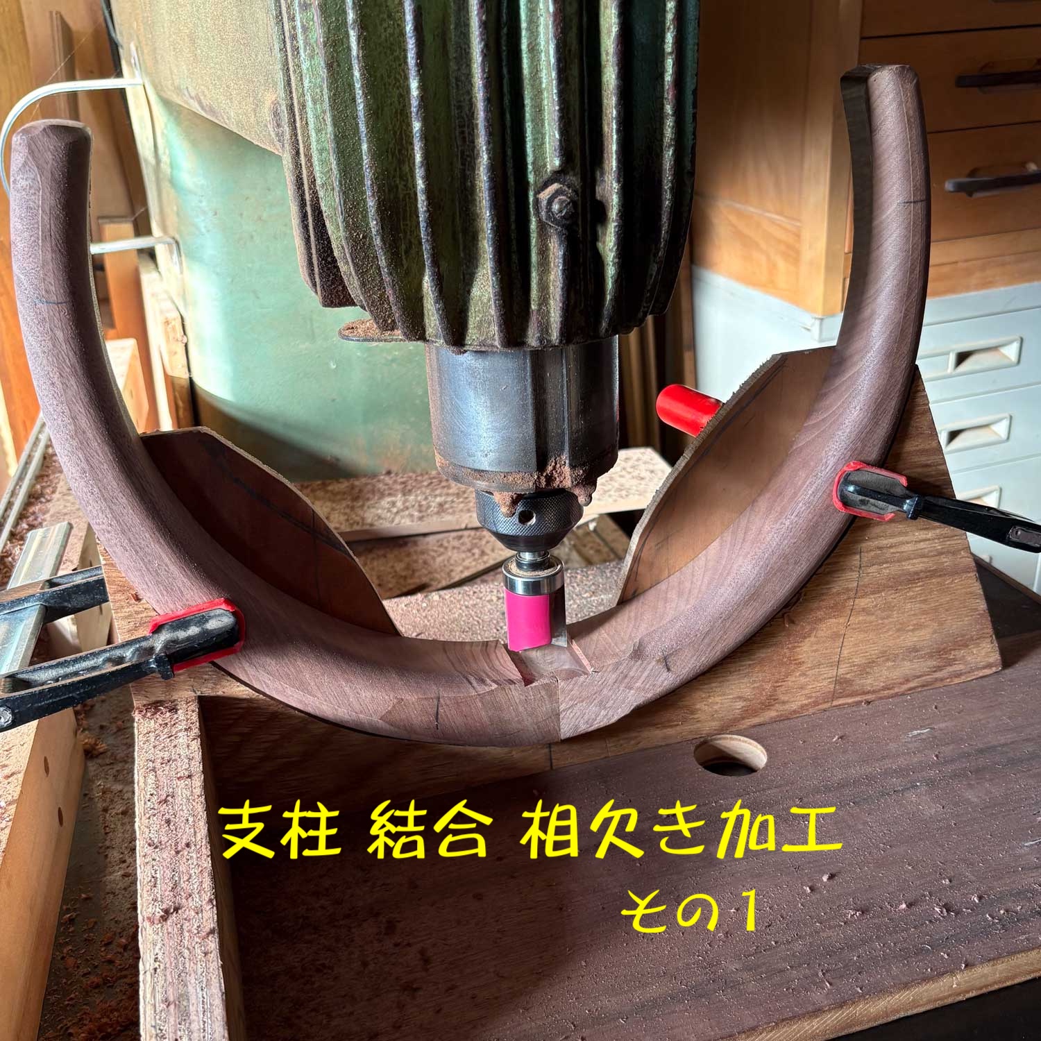 関連して数枚の画像を上げていますが、この相欠き部分の加工は大きな曲部の中央部にあたるところから、ちょっと面倒な加工になります。