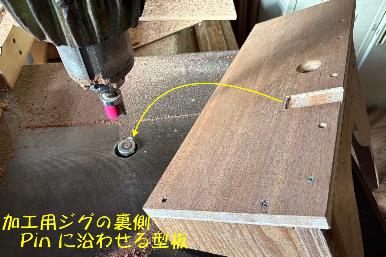 高精度に位置決めするためのジグを作り、ルータービット径と、目的とする切削幅の差異を勘案し、ルーターピンとの関係性から算出される幅を、ジグの裏に穿ち、これで倣い成形(幅決め)が可能になります。