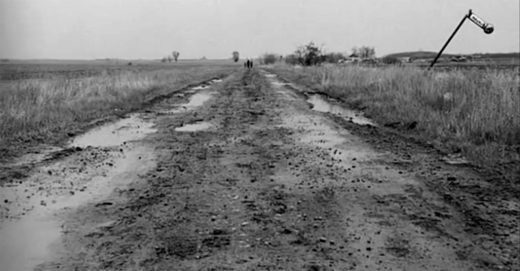 冒頭など、通奏低音の如くの陰鬱な音楽が鳴り響く中、集団農場でのたくさんの牛の群れの移動にカメラを向け横移動するのですが、この1つのカットが延々と8分も続くという具合。