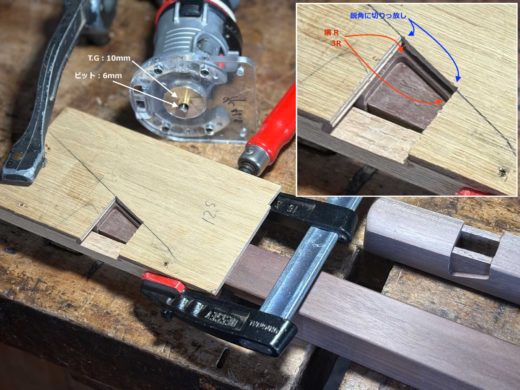 つまり、ルーターでの段欠き加工では、基本的にはどのような径のビットでも対応可能ですが、このように、隅丸を考慮した径の選択をすることで型板作成も よりイージーになりますし、結果、補助的な手加工など無用で、スピーディ、かつ美麗に納まるというお話です。
