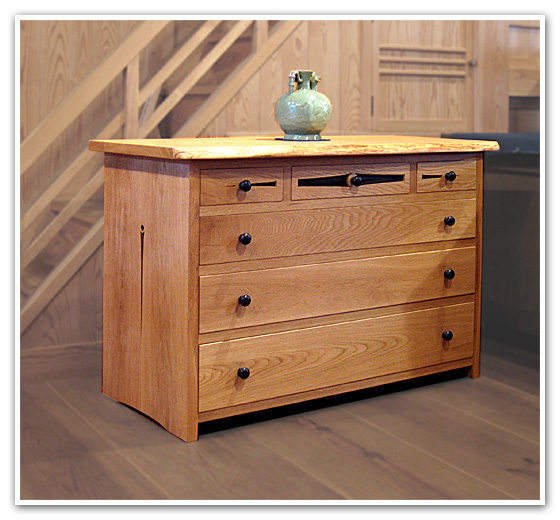 板差しによる構造で、シンプルな構成です。 天板はミズナラ良材の一枚板。 抽斗はすべてセンターガイドレールを設けてありますので、出し入れがスムースです。
