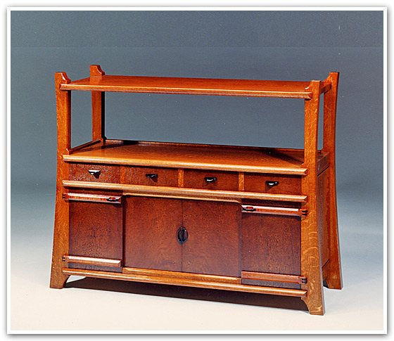 4枚構成の扉は中央2枚が引き戸、左右2枚は開き扉。引き戸は開き扉背部に収まり、これを開けるとフルオープンになります。 扉の腕木は反り止めを兼ねながら柱に木丁番を介し緊結される構造。 楢の古木を用いこの杢をいかすため拭漆としました。