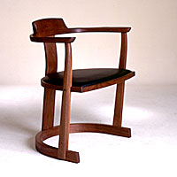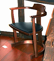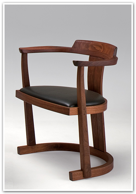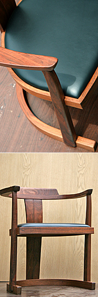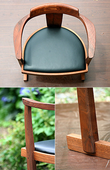 馬蹄型の畳ズリ、座枠をラミネートで構成することで、柔らかい曲線を描き、これに前脚をやや傾斜させて結合させ、緊張感のあるフォルムを生み出しました。 皮革シートのベースには伸縮性のある素材を使い、少しクッションストロークを確保しました。これにより座り心地の高級感が出ました。