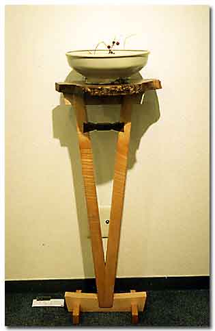 ちぢみ杢を持ったメープルで脚部を、天板にはクラロウォールナットのこぶ杢をナチュラルエッジで構成し、V字型の脚部をチョウネクタイ様のチキリで支えました。
