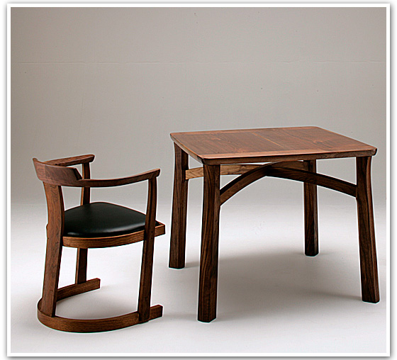 脚部は工房 悠が良く用いるテリ脚のデザインとし、円弧状の貫を交叉させ、脚部頭部に設けたほぞを天板端嵌部に指すという構成。 シンプルな構成でありながら、構造的アイディアをデザイン処理に生かした小テーブルです。