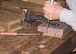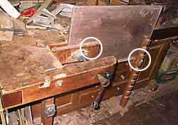 2種類の万力のうち主万力の方は、加工材をしっかりと削り台に固定、圧締するものだ。 この固定という機能は実に有効だ。もちろん削り工程の作業において有効ということだが、他にもサンディングすることも含めあらゆる仕上げ作業などにも有効なのだ。この機能により、他の作業台では鉋がけを含む仕上げ作業の際に、加工物を支えねばならない片手が自由になる。 削り作業についてさらに付け加えると、広葉樹、雑木には様々な木理があり、一様ではない。プレナーで機械削りされたあと、鉋で仕上げ削りする際、局所的に逆目が止まりずらかったり、大きな板で反りがあり、どうしてもその状態で削り挙げねばならない時、裏にカンナくずなどを敷き、両サイドを強く圧締することによりやや強制的に反らし、削り挙げるという芸当も時には必要なのだが、このようなことも万力がそなわっていれば簡単なことだ。 この加工物の固定に活躍するのが、Bench dog。これを可動式の主万力に穿ったDog hollに差し込み、適宜の高さにし(内部にスプリングを設けるなどして自在に高さを変えられる)、相手方の天板上に一定の間隔で複数穿かれたDog hollにも差し込み、加工物はこれを介し万力で締め付けることでしっかりと圧締することができる。 次にこの主万力(Tail Vise)は、側万力(Shoulder Vise)とも共通する機能だが、この万力の口板に加工物を立てて締め、固定することができる。もちろんいわゆる普通の万力でもこうした機能はあるが、これらは挟む主機能部である口板の下部にガイドロッド、メインスクリューなどの邪魔な機能部品があり加工物を縦に挟むことはできない。対し、ワークベンチの主万力はかなり広い面積(ボクのは約9cm×9cm)の口板があり、この部分は下部にも何も邪魔する機構部などなく自由にどのような形状の加工物も挟み、固定することができる。