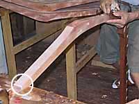 長尺ものの板の木端や、木口の削り、仕上げは少し困難な工程になる。前述のように削りは加工物の確 実な固定というものが前提になるからだ。いわゆるアテ台だと、この条件を満たす機能はない。 対し、ワークベンチでは側万力(Shoulder Vise)が威力を発揮する。主万力と同様、ここも邪魔する機構部品などないので任意にどのような姿にでも挟むことができる。木端削りの場合には先端をこの側万力(Shoulder Vise)に挟み、他方を、Bench slave(補助具?)で受け支えてやればよいのだ。 また木口削りはというと、床から垂直に加工物を立てかけ、側万力(Shoulder Vise)に挟めばよいだけなのだ。5尺を越えるものなどは、ワークベンチ上に乗り作業すればいいのだ。身長の低いボクでも7尺近くまでこのスタイルでの水平姿勢での木口削りが可能)。